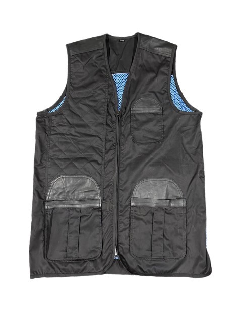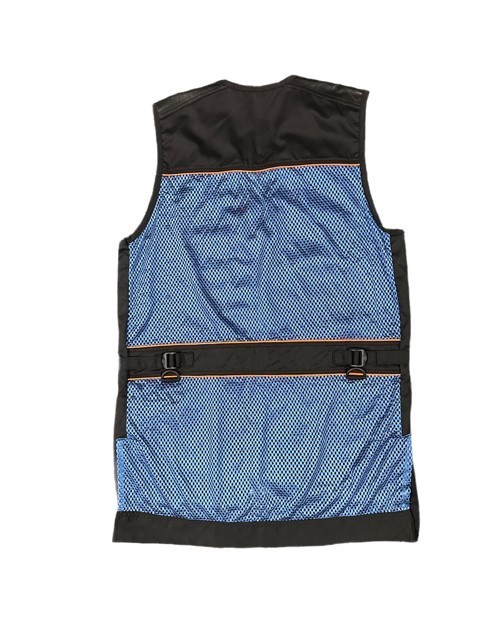 Mens vest with black fabric, bright blue mesh and orange trim. Leather on tops of pockets and shoulders for durability. Adjustable tabs on waistband. Towel hanging tabs on back.