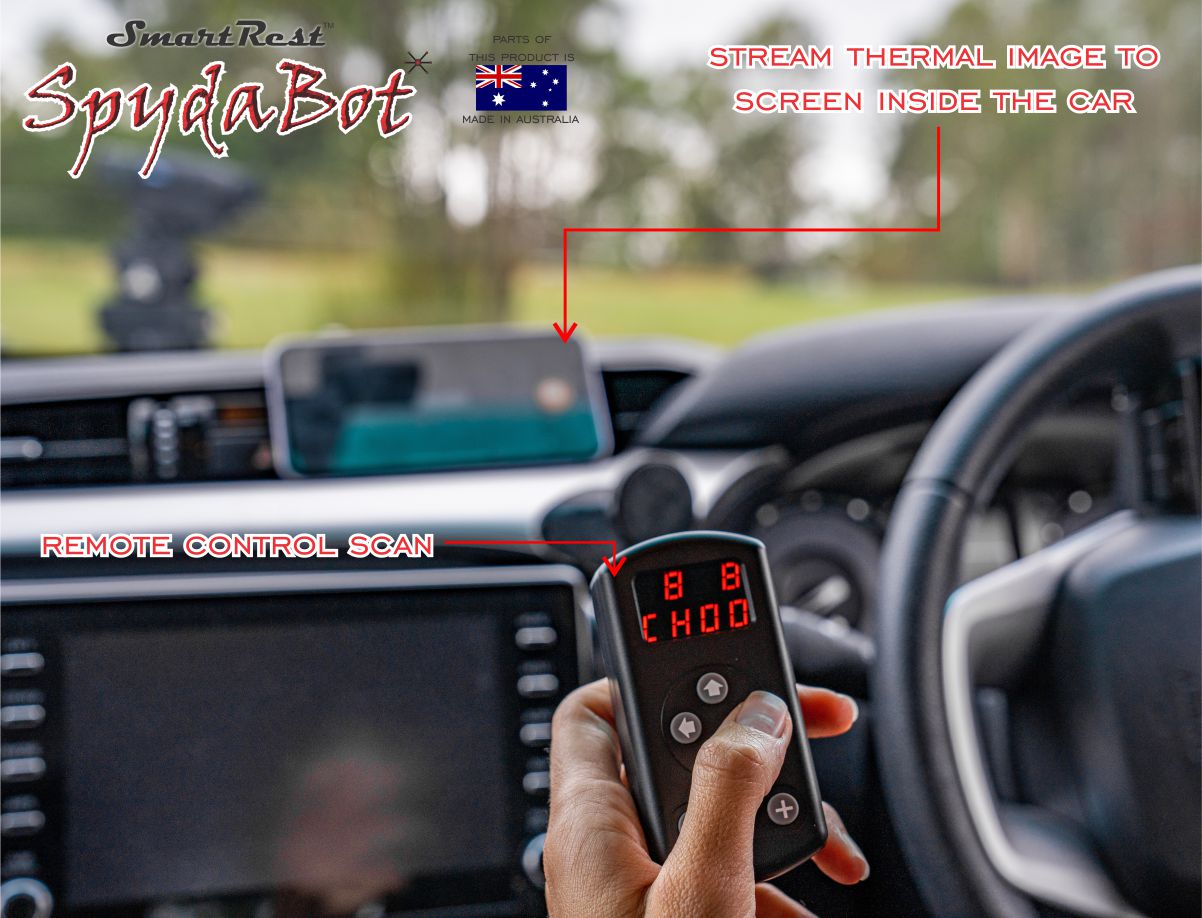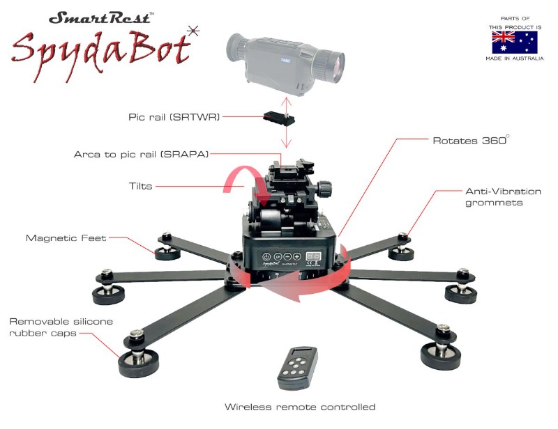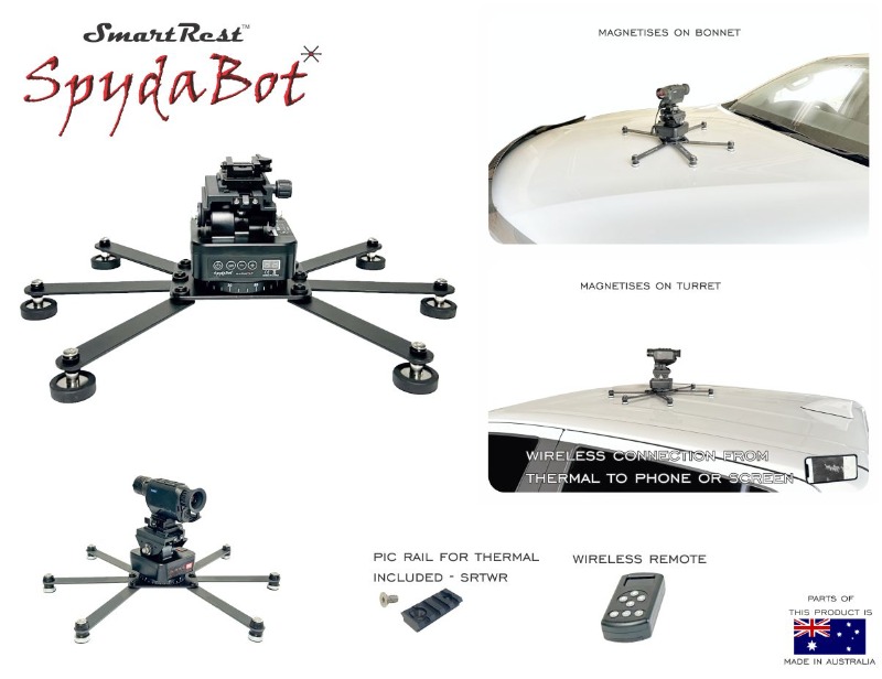 The SpydaBot is a wireless remote controlled robotic unit mounted on six magnetic legs that magnetise to a metal surface. The application of this set up is usually on a vehicle bonnet or turret of a vehicle where the passengers of the vehicle can control a thermal camera from inside the vehicle. The thermal camera outputs a wireless image to a smart screen inside the vehicle for the passengers to view. The magnetic feet have been arranged in a wide foot print around the central unit to ensure excellent adherence to the vehicle even in intensely rough conditions.