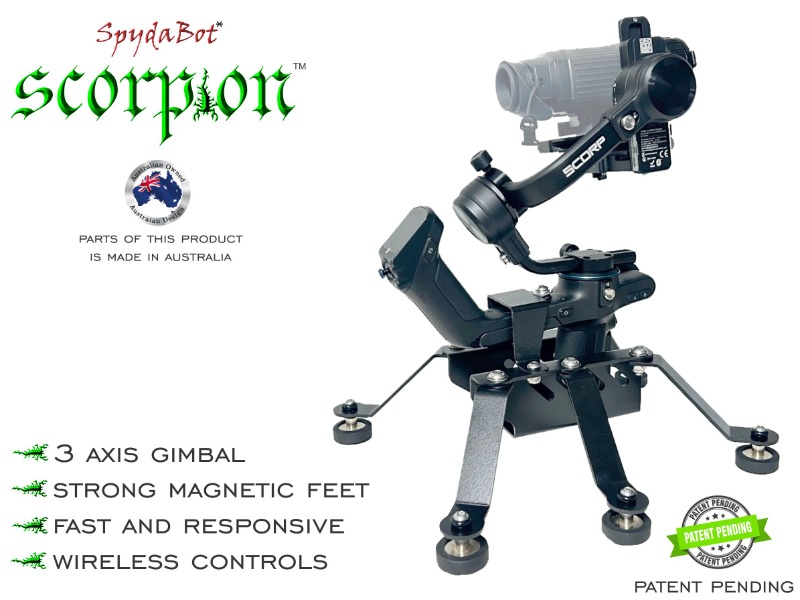 The SpydaBot Scorpion is a 3 axis gimbal which can be wirelessly remote controlled. It features 3 axis leveling ability and can control your camera device wirelessly via mobile phone app (note: Android phones have a different gyro orientation which means the phone will need to be upright to represent a horizontal position in the Gimbal - Apple's horizontal position is sync'd as horizontal to the Gimbal). The Australian made housing body is a carrier cradler fitted with magnetic feet. The feet can sit on any surface but will magnetize with extreme confidence that it will not only hold on firmly but also withstand any terrain while magnetized to a car. You can have supreme confidence when using SmartRest designed products and rest assured your expensive devices are safe in our carrier systems.